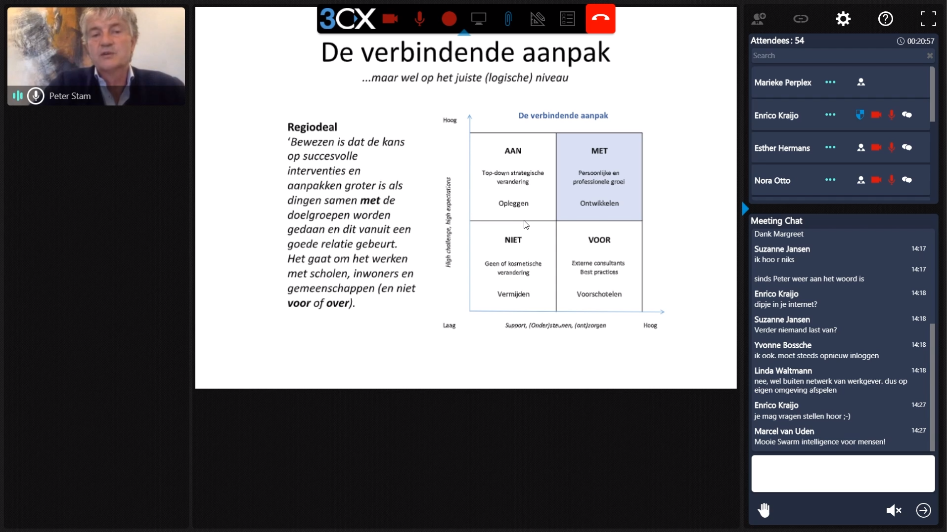 De leidinggevenden aan projectleiders, realiseerden zich al snel dat ook hun medewerkers behoefte hebben aan kennis- en ervaringsuitwisseling. Daarom richten we ons ook op de project-, proces- en programmamanagers uit het fysieke- en sociale domein. Zij gaven op hun beurt weer aan dat hun ondersteuners ook behoefte hebben aan kennis en ervaringsuitwisseling, dus daarom richten we ons ook op de project en programma ondersteuners. Zie in een notendop onze ontwikkeling als vereniging: bottom up! En dan hebben het nog niets eens gehad over het feit dat provincies en waterschappen ook aanhaken op onze vereniging.