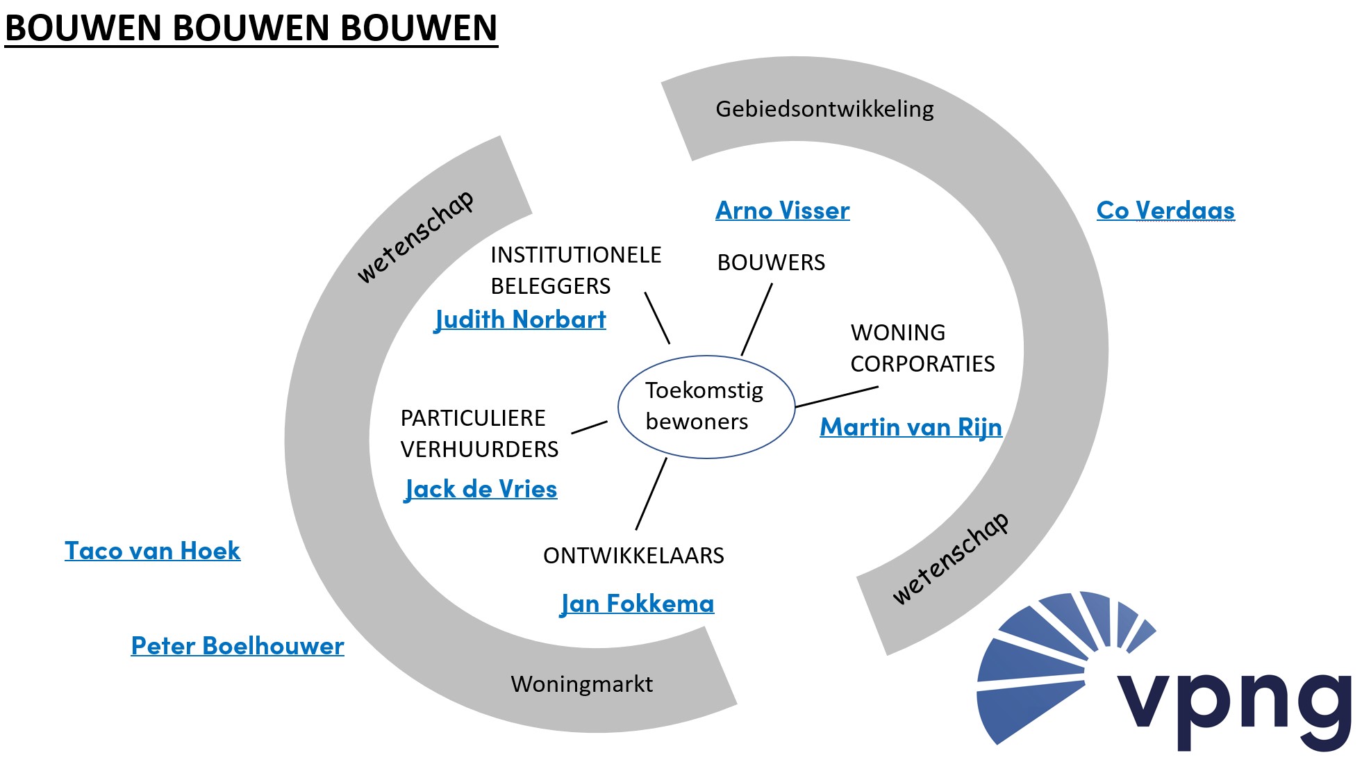 Wat staat het hoogste op de agenda van jouw bestuurders? Woningbouw! Daarom organiseert de VPNG in de maanden februari en maart een serie van zeven webinars met top-sprekers om ons te helpen het totale plaatje te blijven zien. Het generieke beeld is dat de woningbouw vastgelopen is. Is dat echt zo? En waar zitten de knoppen om aan te draaien om de neergaande trend te keren? Wat komt er (nog meer) op ons af? En vooral hoe zien onze partners zoals ontwikkelaars en beleggers de rol van gemeenten en provincies voor zich?