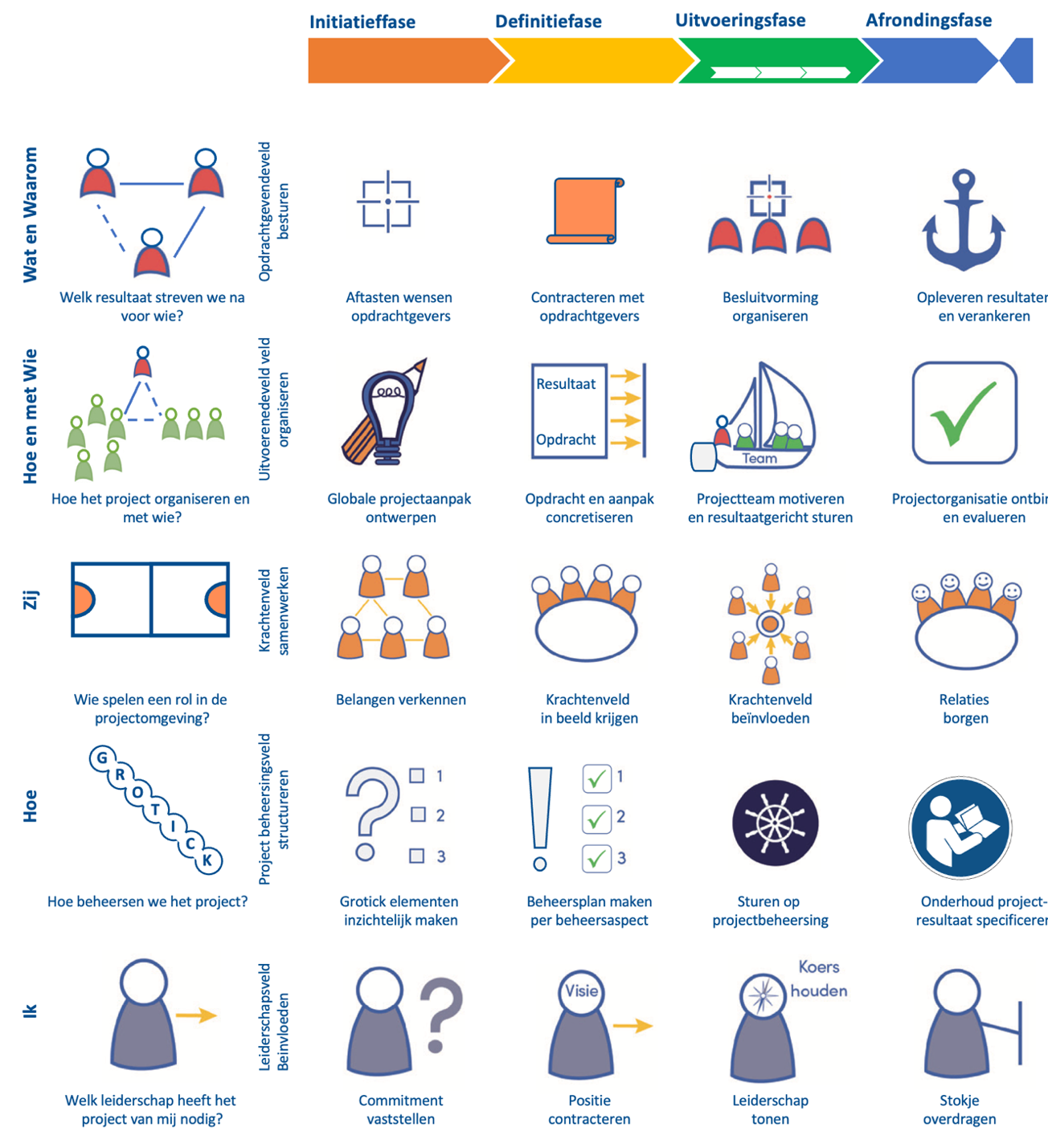 Wanneer je de toolbox opent, kom je eerst terecht bij een overzicht over hoe de toolbox werkt. Op dit moment zijn er tientallen tools en dat worden er de komende tijd nog veel meer. Dus je moet ze ordenen. Een projectmanager is bezig met vijf velden: Opdrachtgevend veld, uitvoerend veld, krachtenveld, leiderschapsveld en het projectbeheersingsveld. Hiernaast werkt een projectmanager volgens fasen: de initiatieffase, definitiefase, uitvoeringsfase en de afrondingsfase. De velden en fasen kan je vervolgens in een matrix zetten.