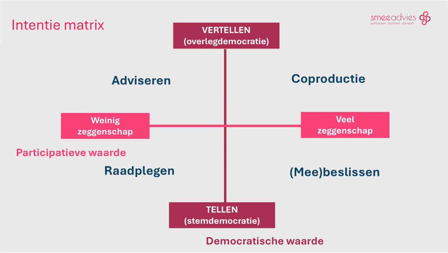 - Horizontale as (participatieve waarden): Hoeveel zeggenschap geef je? Van weinig (adviseren/raadplegen) tot veel (meebeslissen, zoals bij referenda).