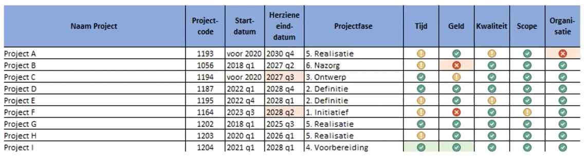 Hier worden per project de aspecten tijd, geld, kwaliteit, scope en organisatie weergegeven. Daarnaast wordt zichtbaar of een stoplicht is verslechterd of verbeterd ten opzichte van de vorige rapportage.
